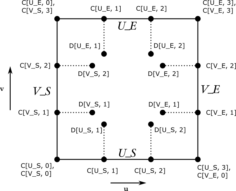 これらの境界線を構成する制御点を「境界制御点」と呼び、 図中の「C」で構成されている制御点にあたります。 これらの点位置は setBoundary() で設定が可能で、 「曲線名」と「ID」によって指定します。 図中の境界制御点の一番目が曲線名、二番目が ID にあたります。 4隅の制御点については指定方法が 2 種類あります。 例えば、図の左上の制御点は SetBoundary(fk_UV.U_E, 0, V) と SetBoundary(fk_UV.V_S, 3, V) の両方の指定方法があります。